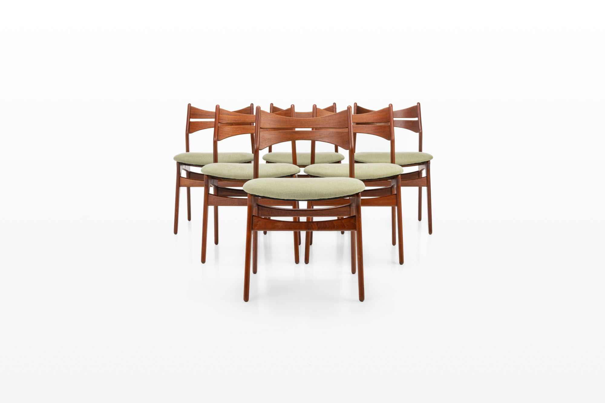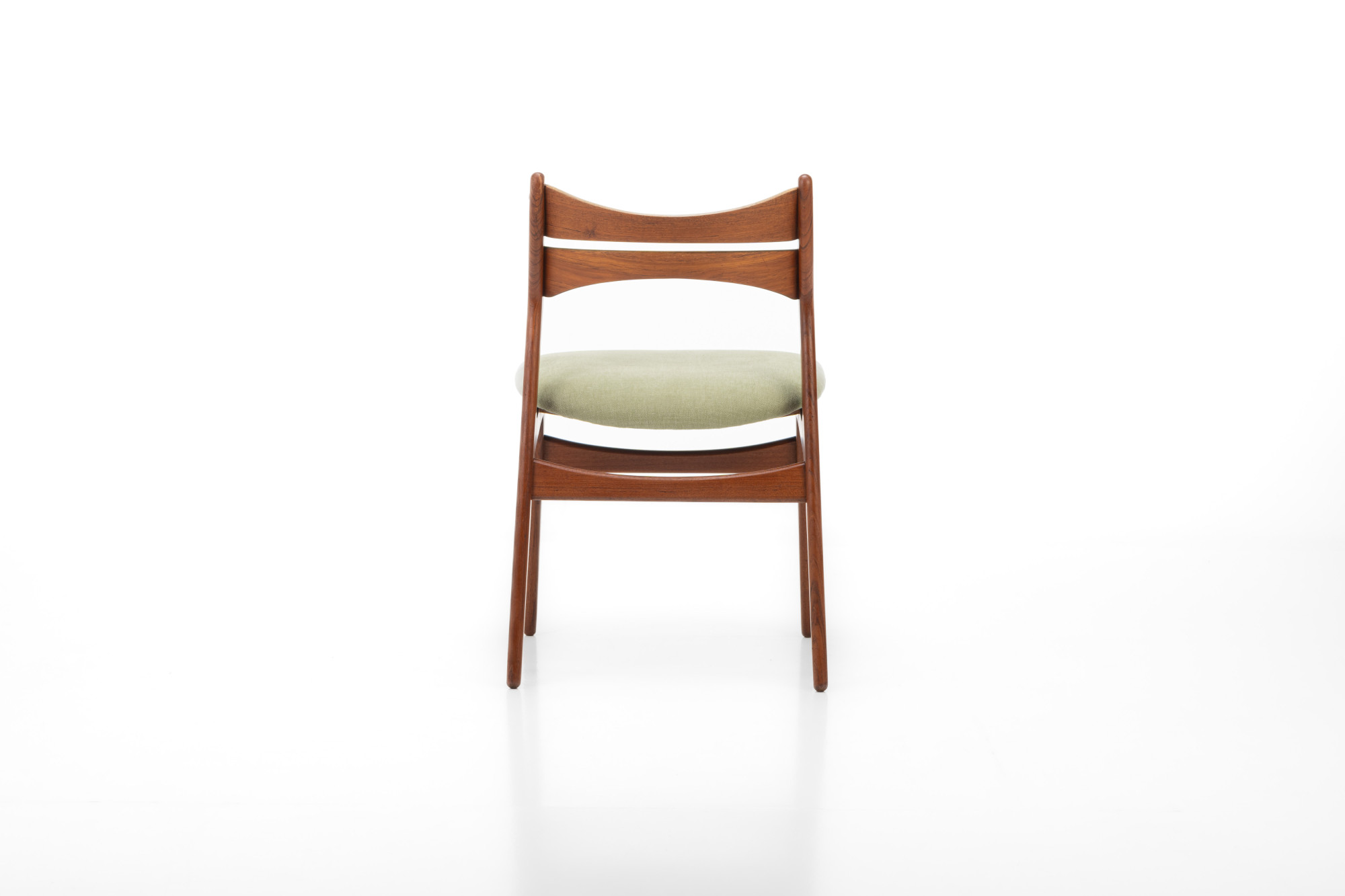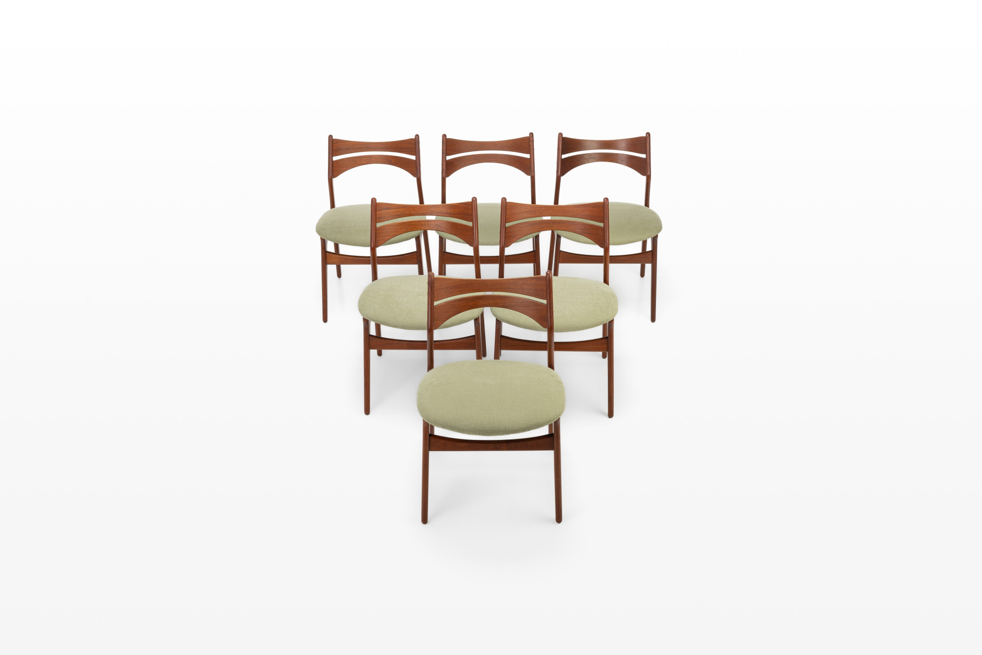 Set of six 'Model 310' dining chairs designed by Erik Buch for Christian Christensen Møbelfabrik, Denmark 1960s. The chairs are extremely comfortable and have been reupholstered with a light green fabric.