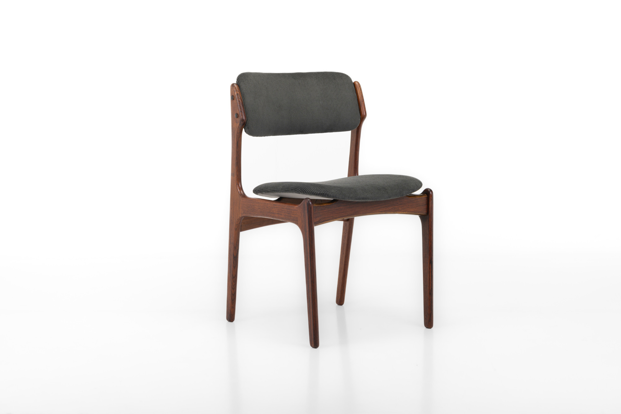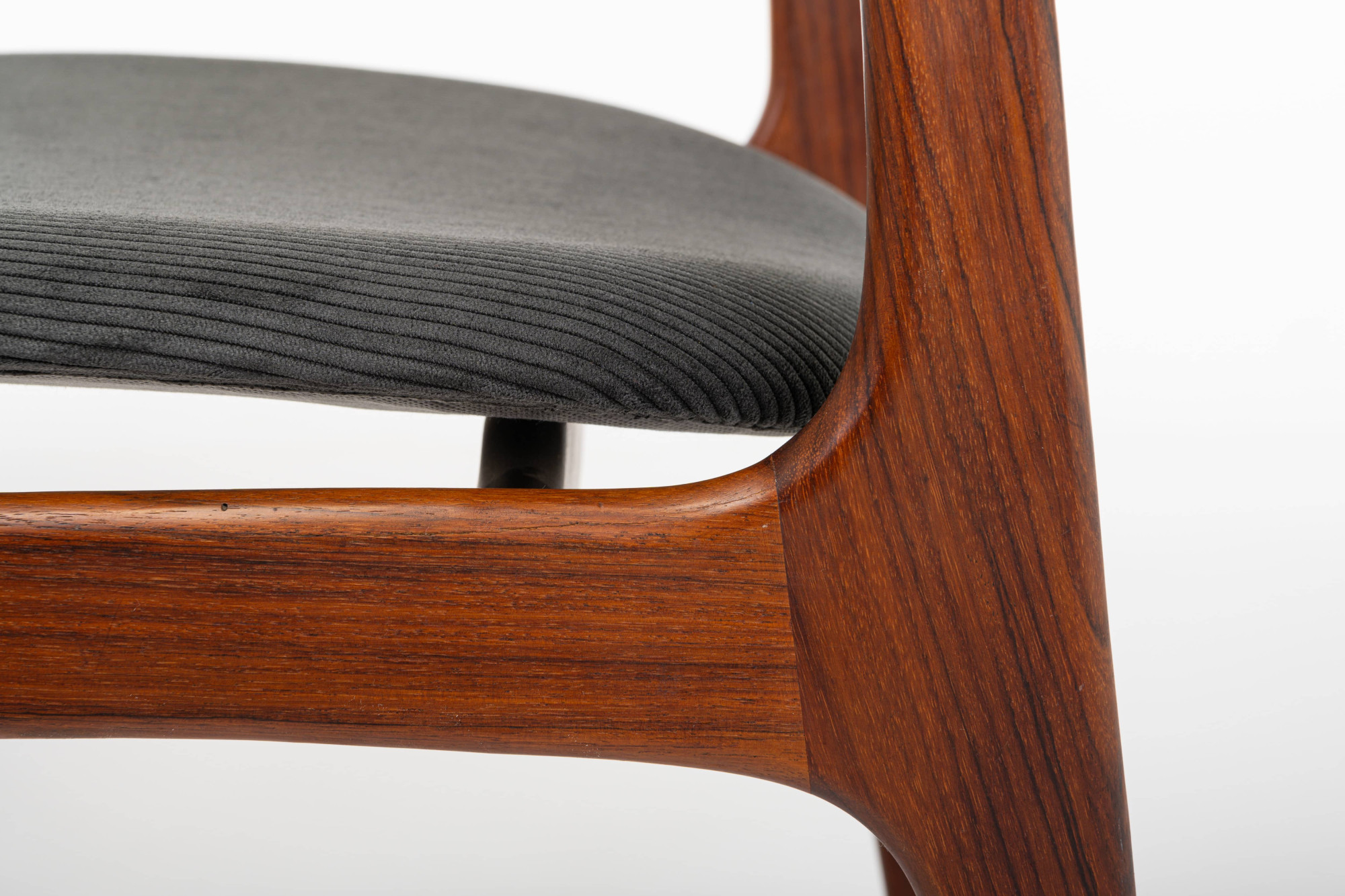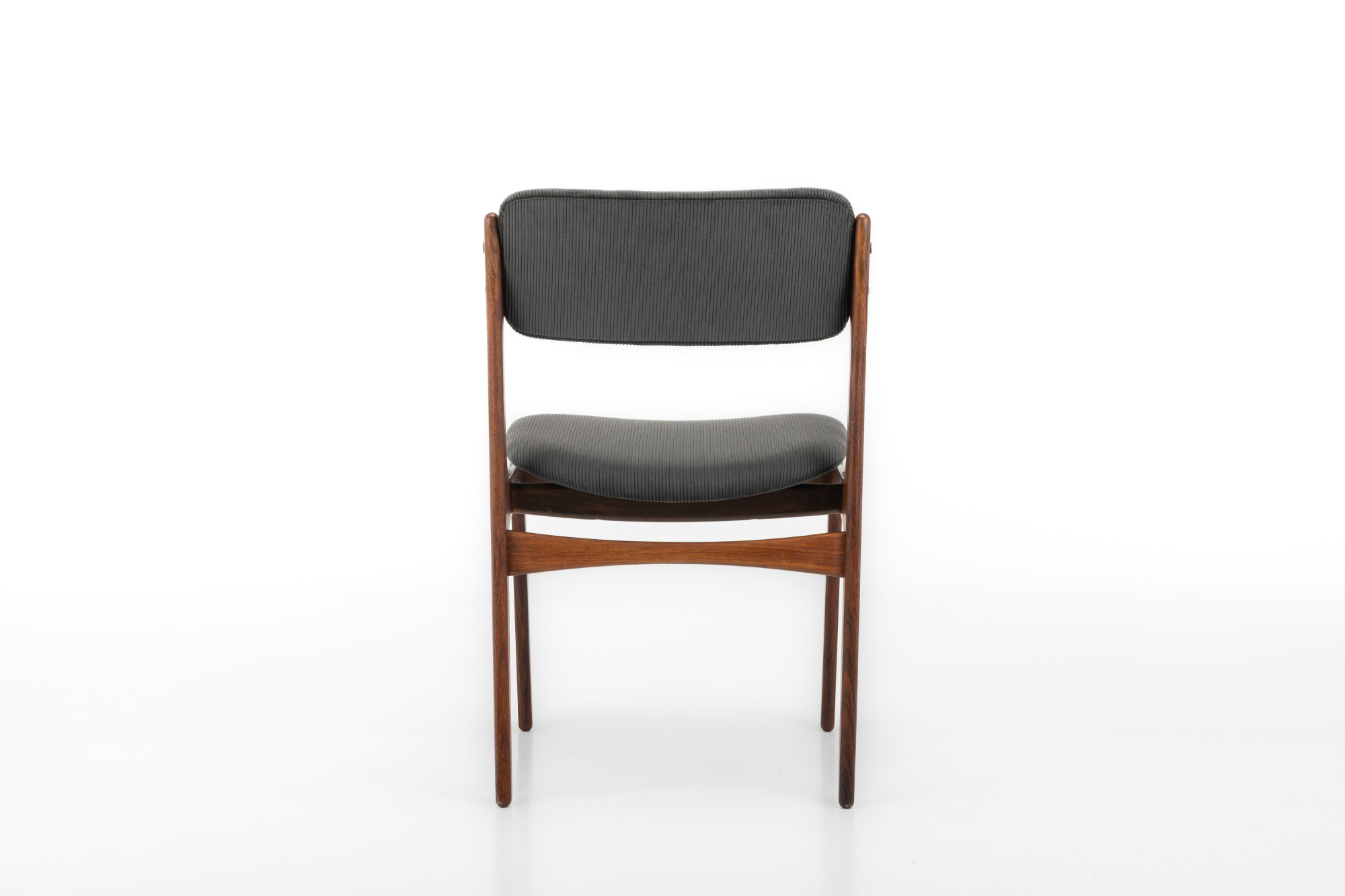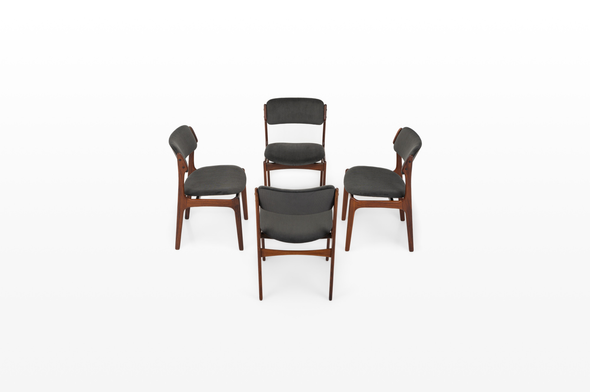 Set of four 'Model 49' dining chairs designed by Erik Buch for O.D. Møbler, Denmark 1960s. The chairs have a rosewood frame and are reupholstered with dark grey corduroy fabric.