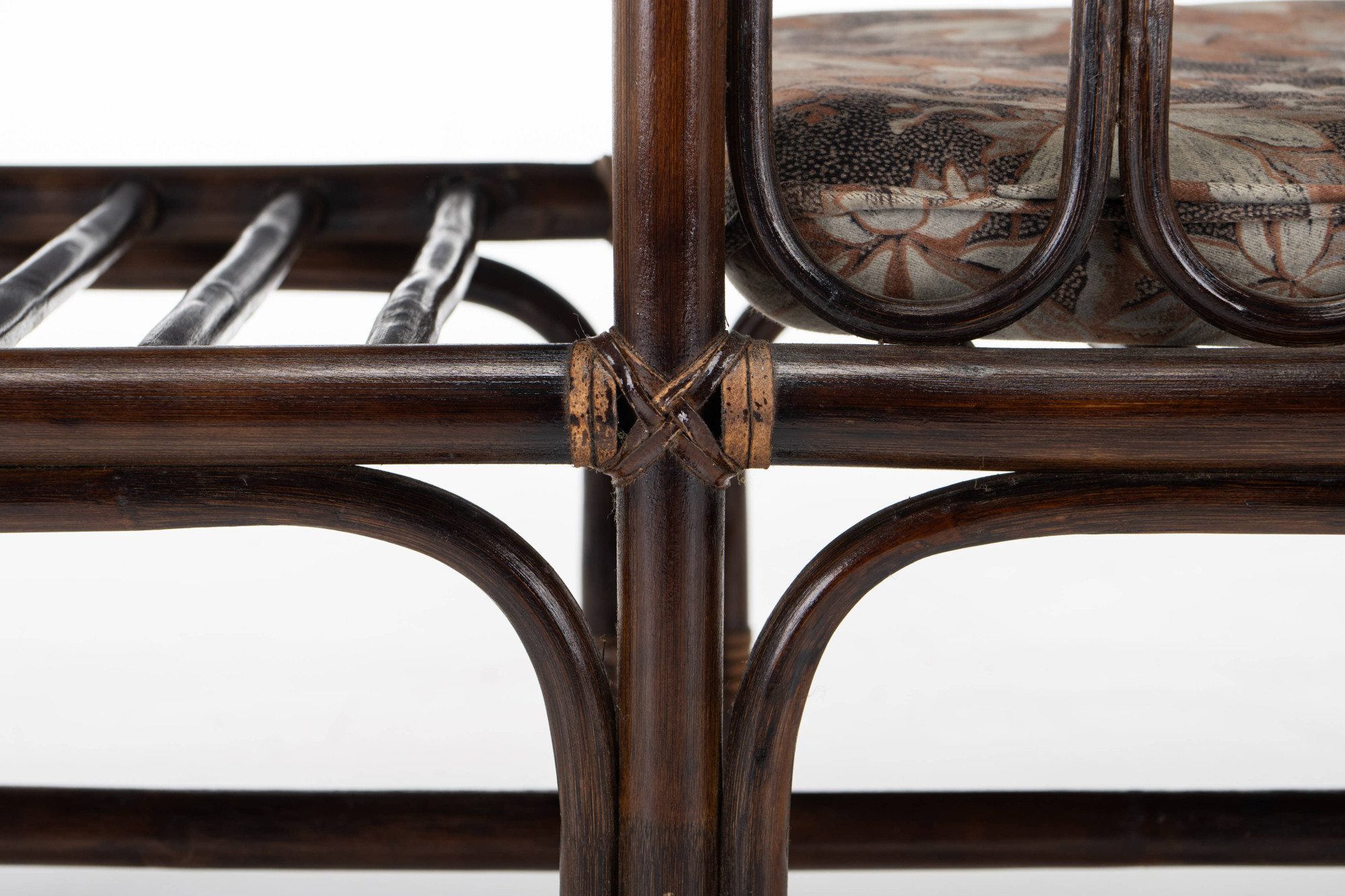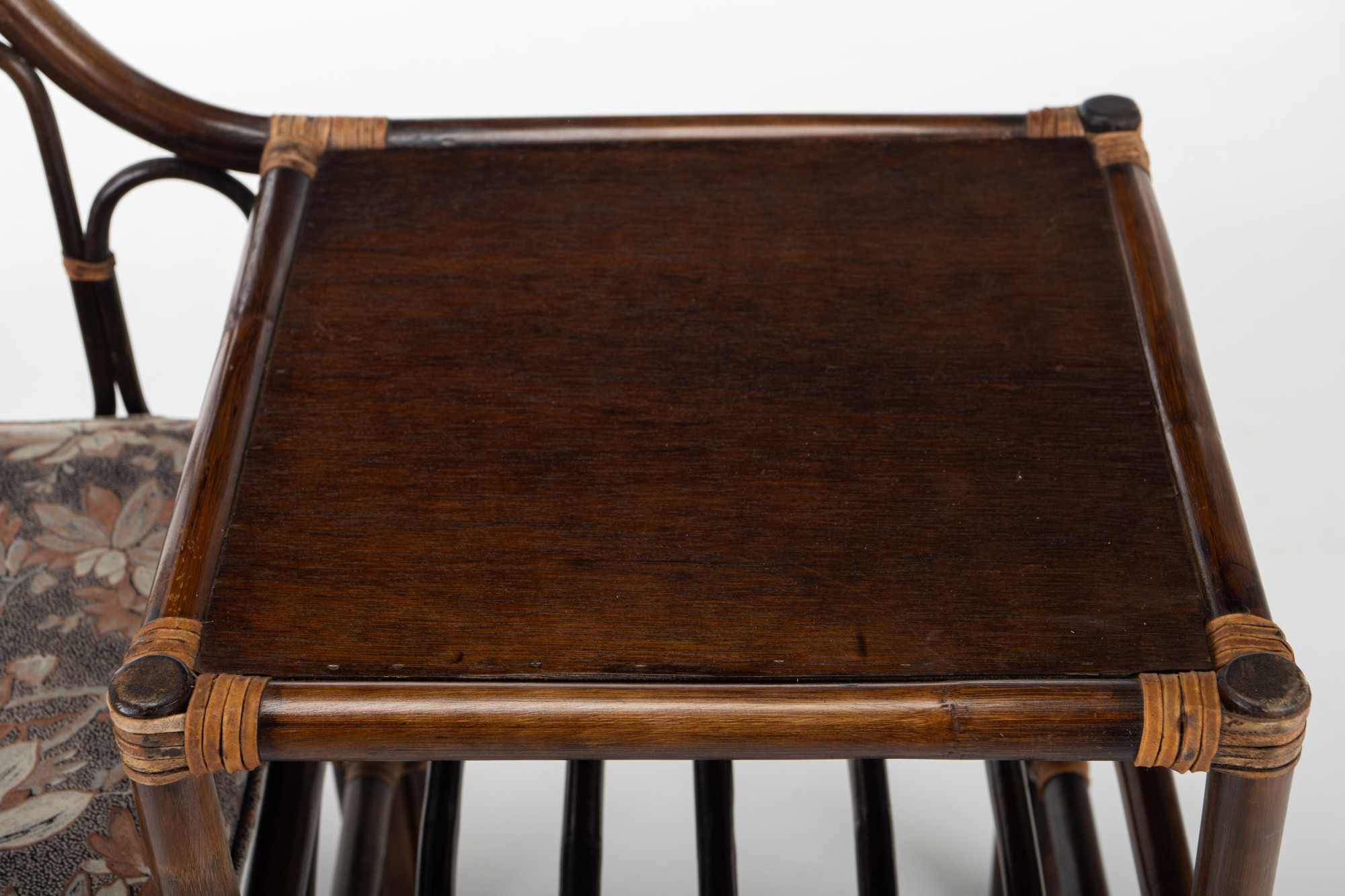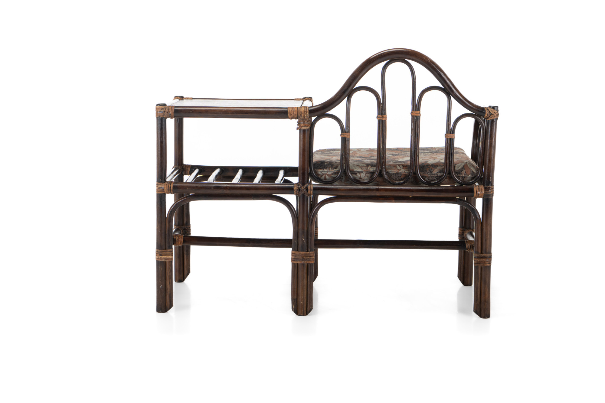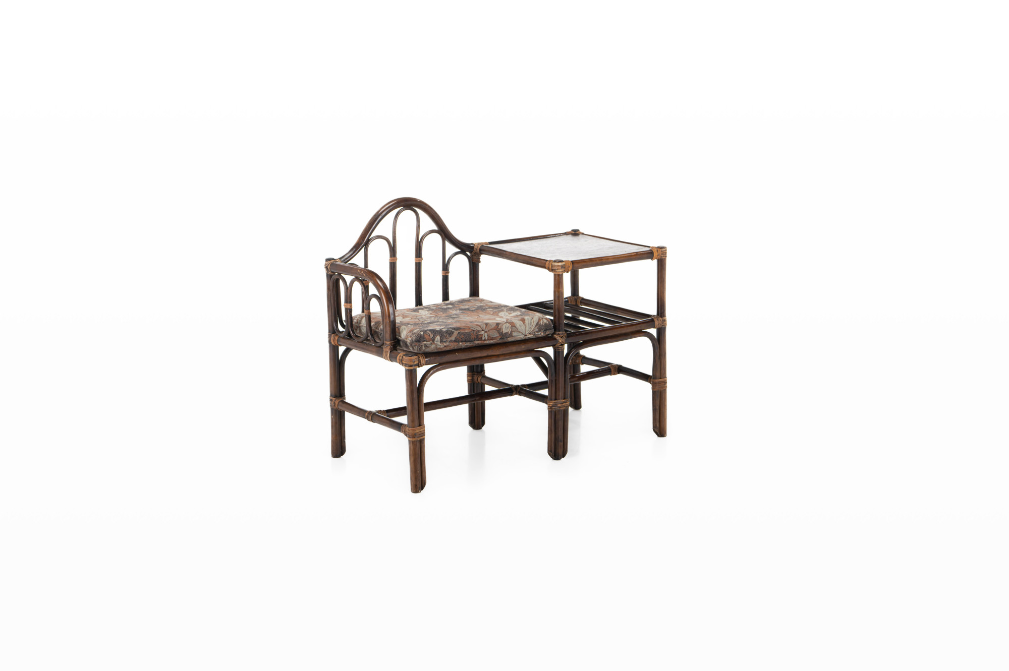 Nice vintage telephone bench in bamboo and rattan. It is divided into a sitting area and a table.
