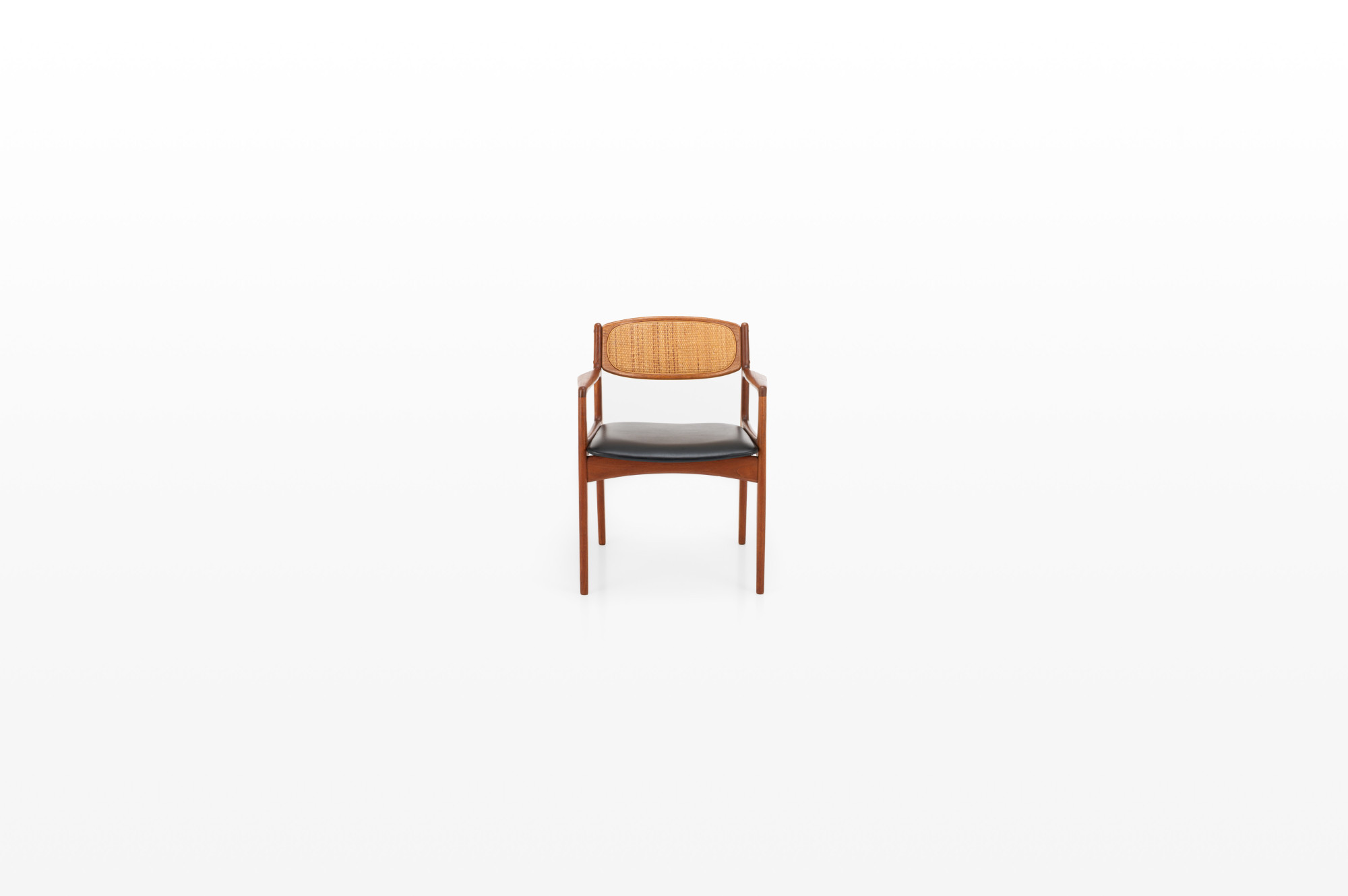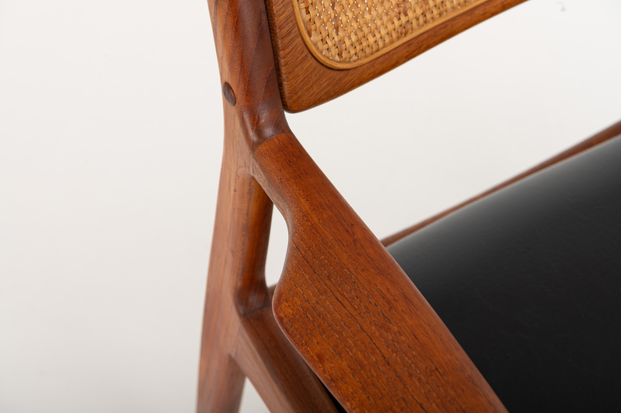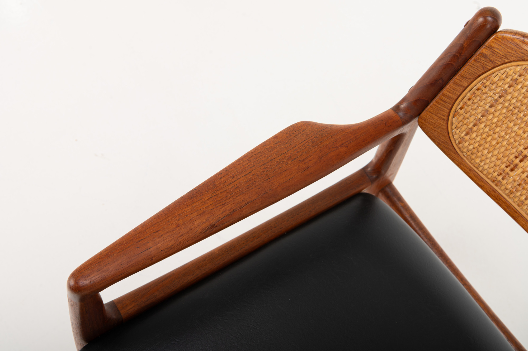 This elegant teak armchair embodies the best of Danish modern design, featuring graceful lines, a beautifully curved frame, and a woven rattan backrest. The seat has its original black leather upholstery, adding a touch of authenticity and vintage character to the piece.