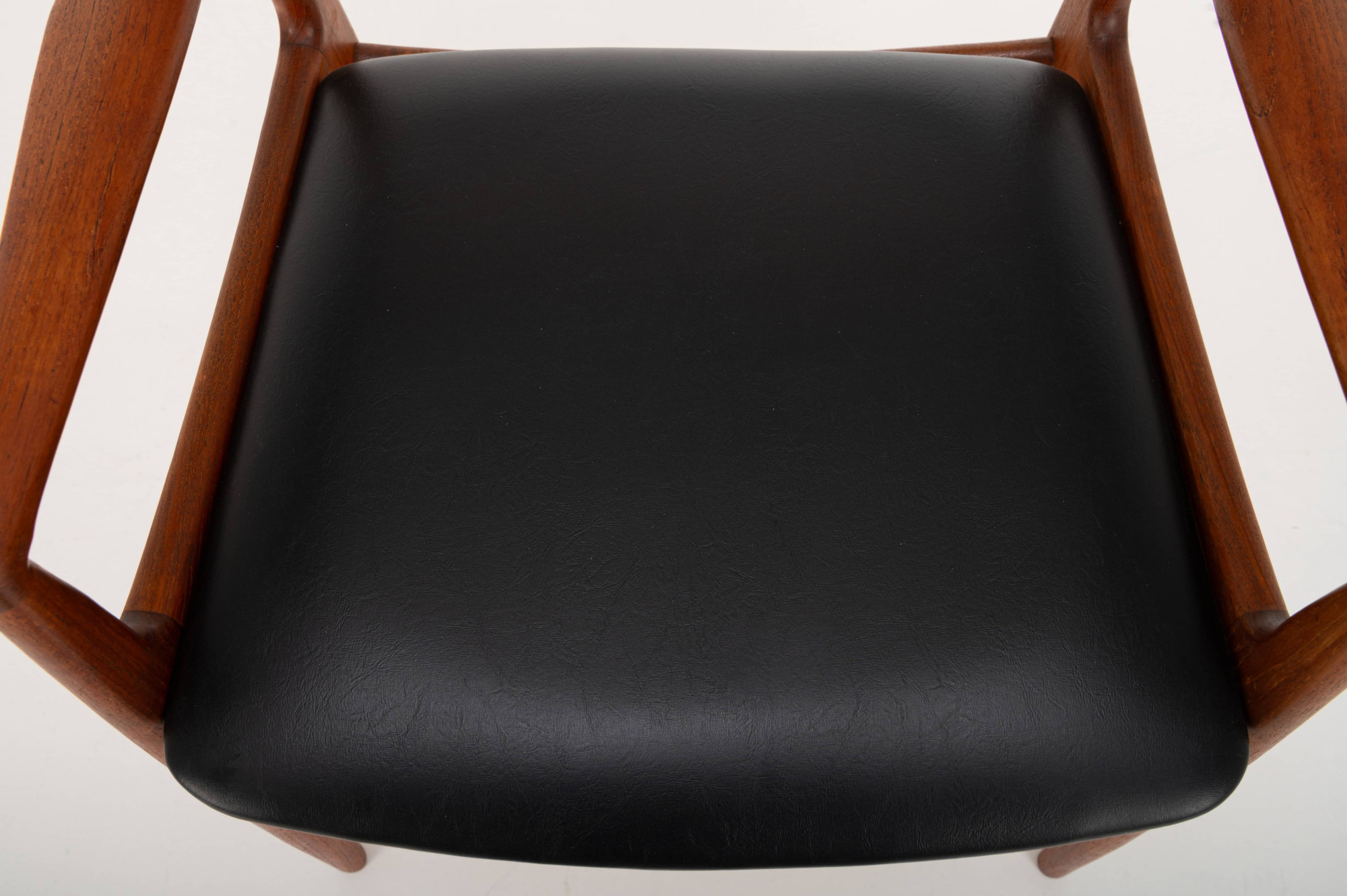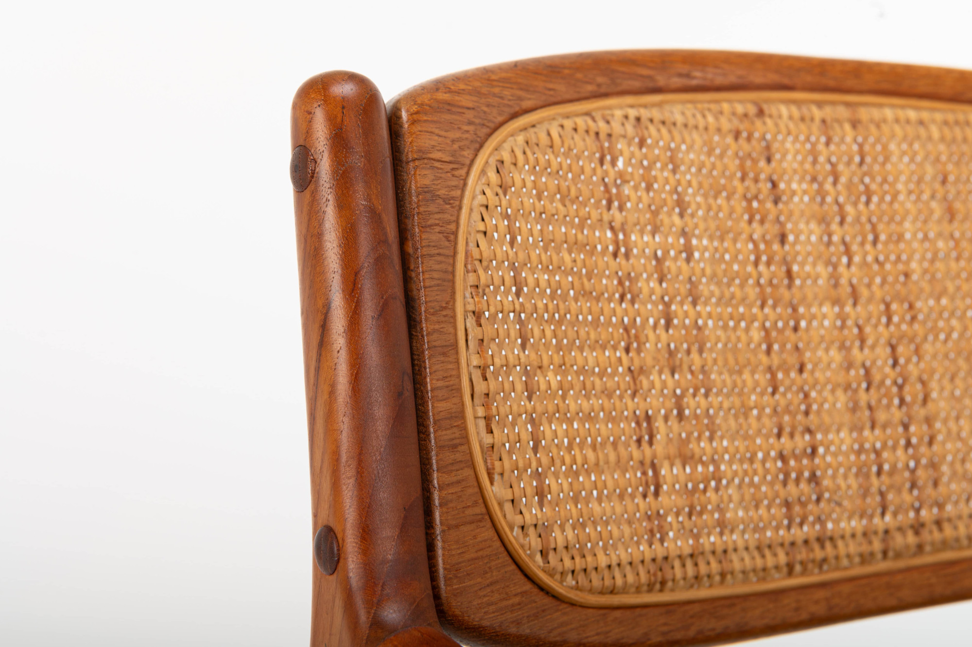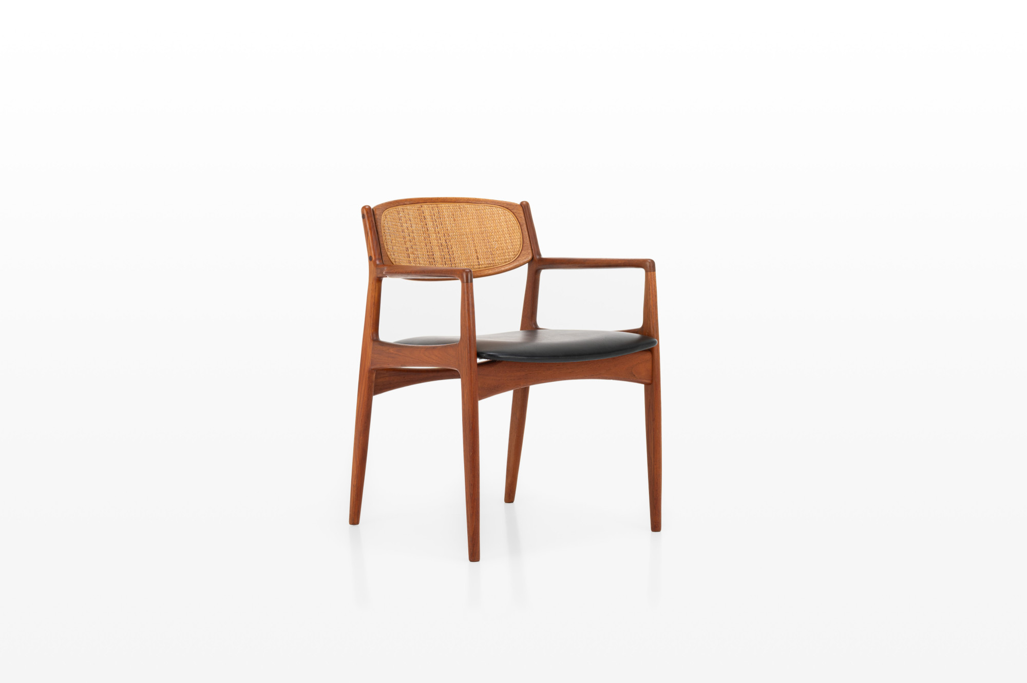 This elegant teak armchair embodies the best of Danish modern design, featuring graceful lines, a beautifully curved frame, and a woven rattan backrest. The seat has its original black leather upholstery, adding a touch of authenticity and vintage character to the piece.