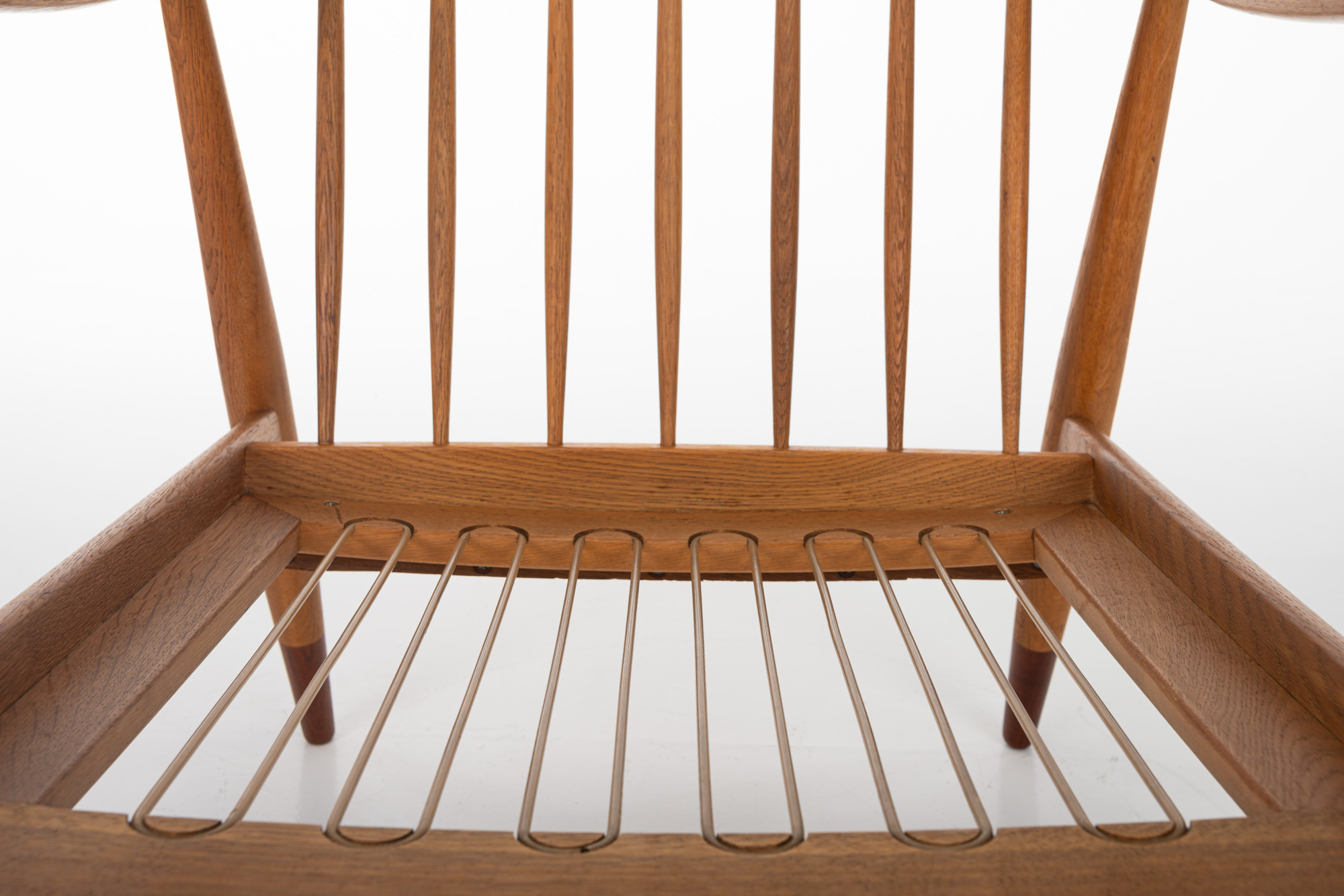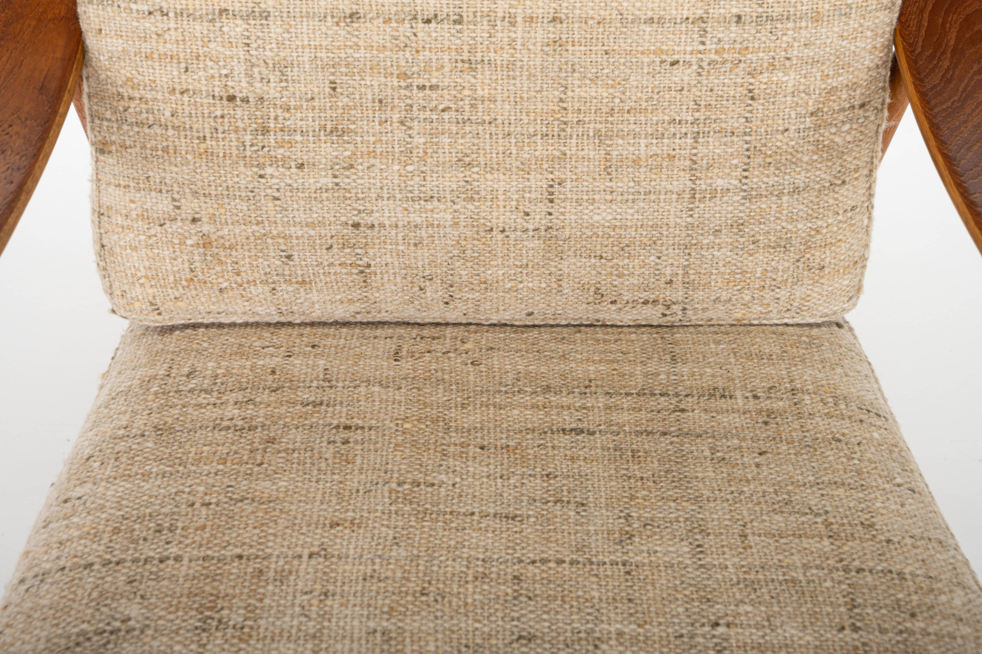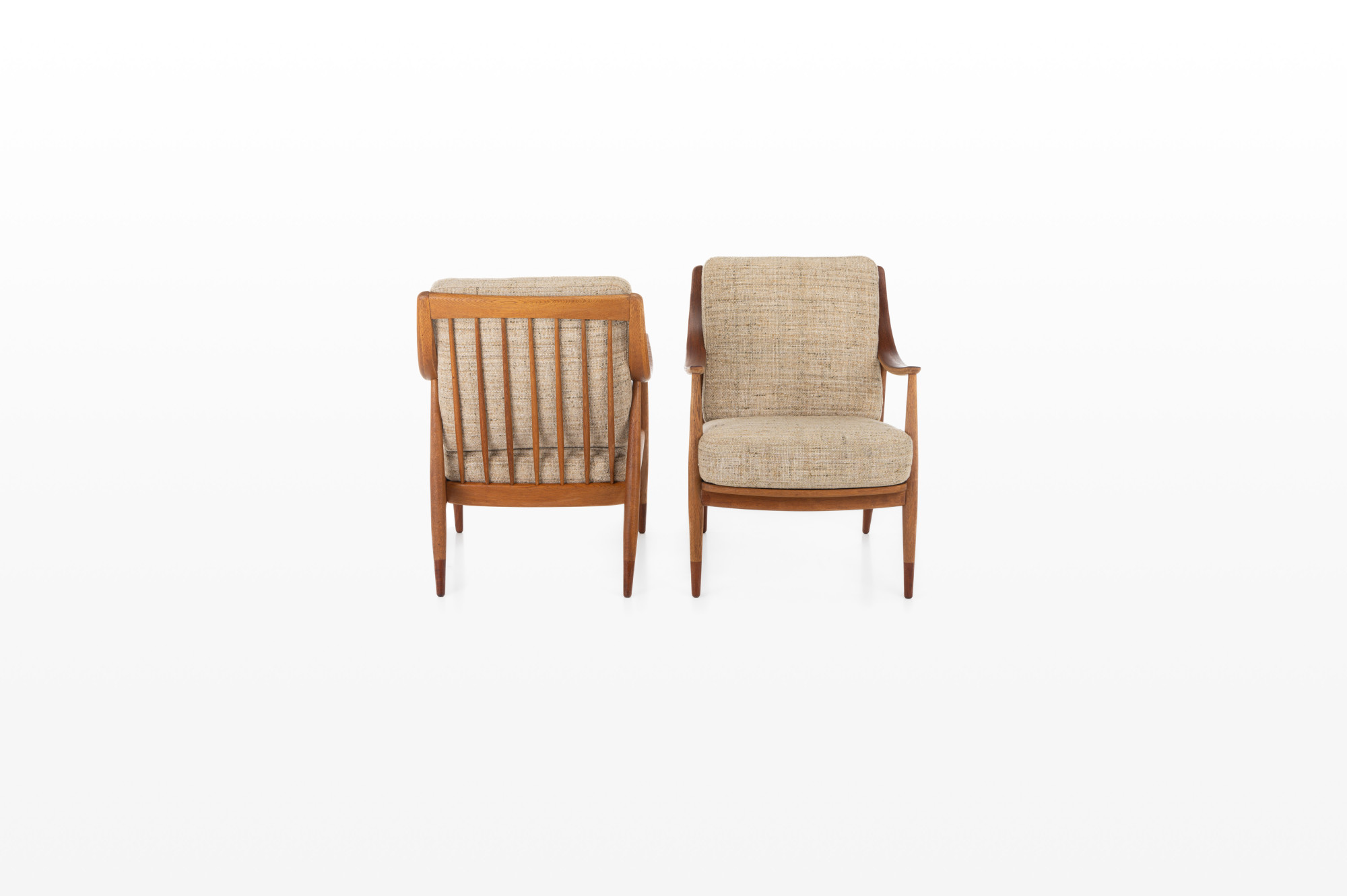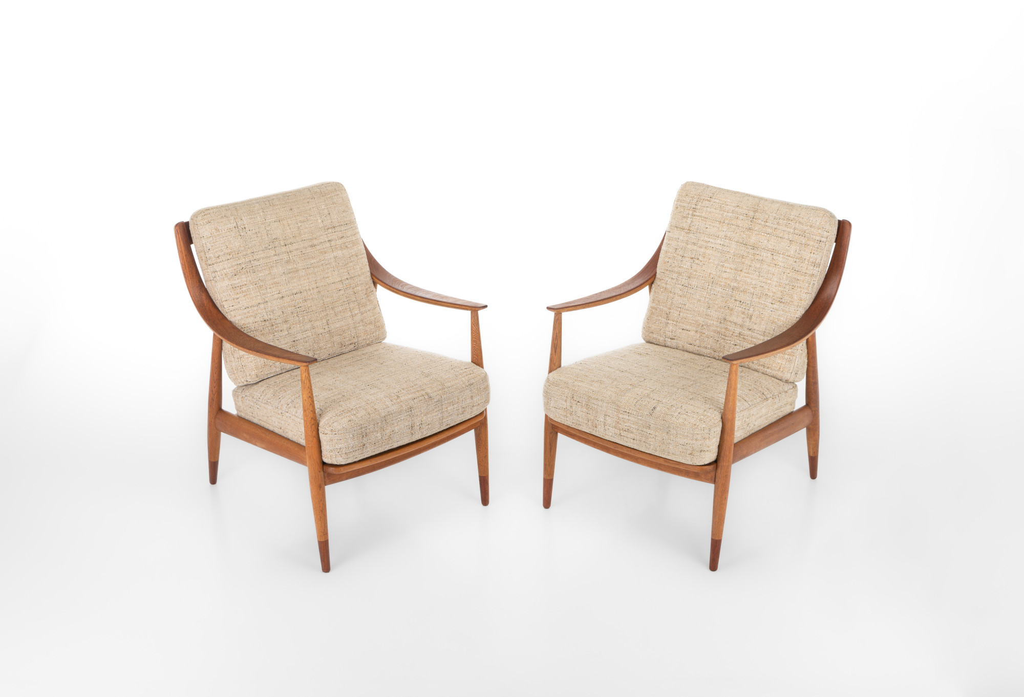 Beautiful set of two FD144 armchairs designed by Peter Hvidt and Orla Mølgaard Nielsen for France & Daverkosen in 1953. The frame of the armchairs is in oak and teak with the original wool cushions. This set is in great condition.