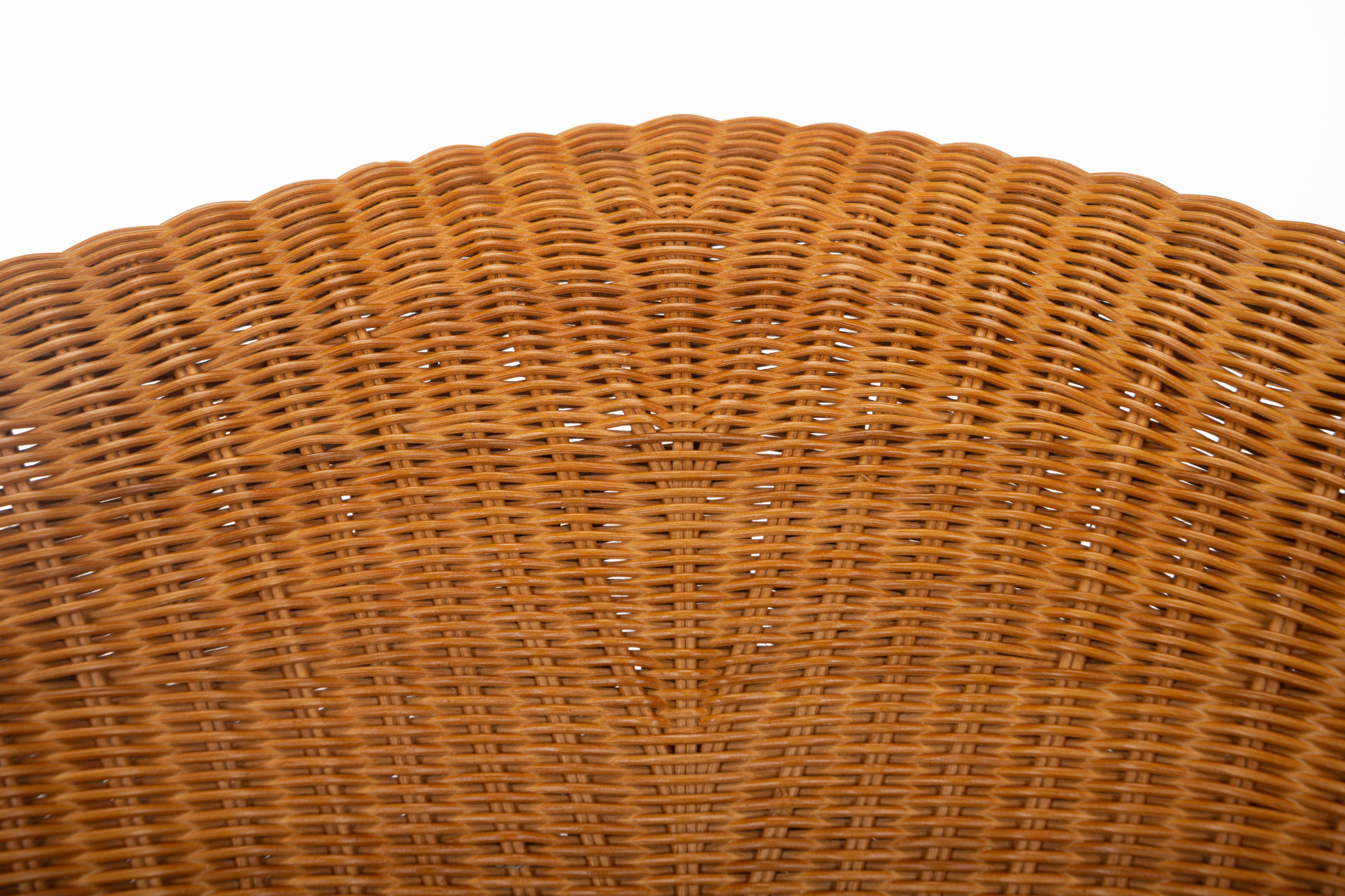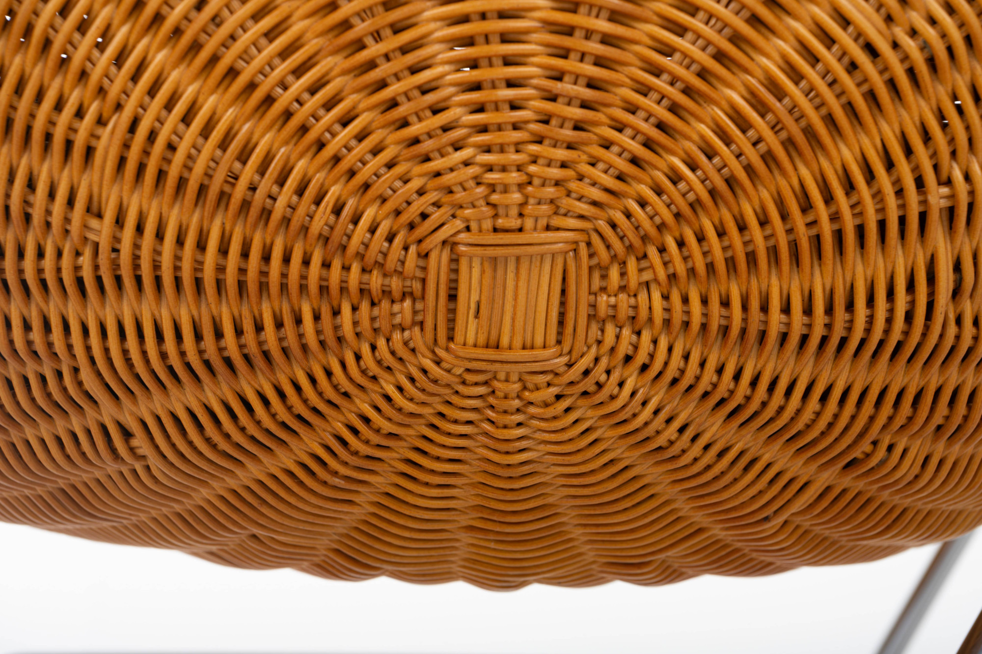 Set of two lounge chairs in wicker and chrome. The set is still in very good condition and comes with a dark blue leather cushion.